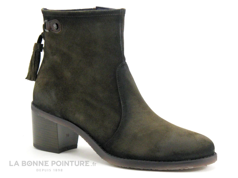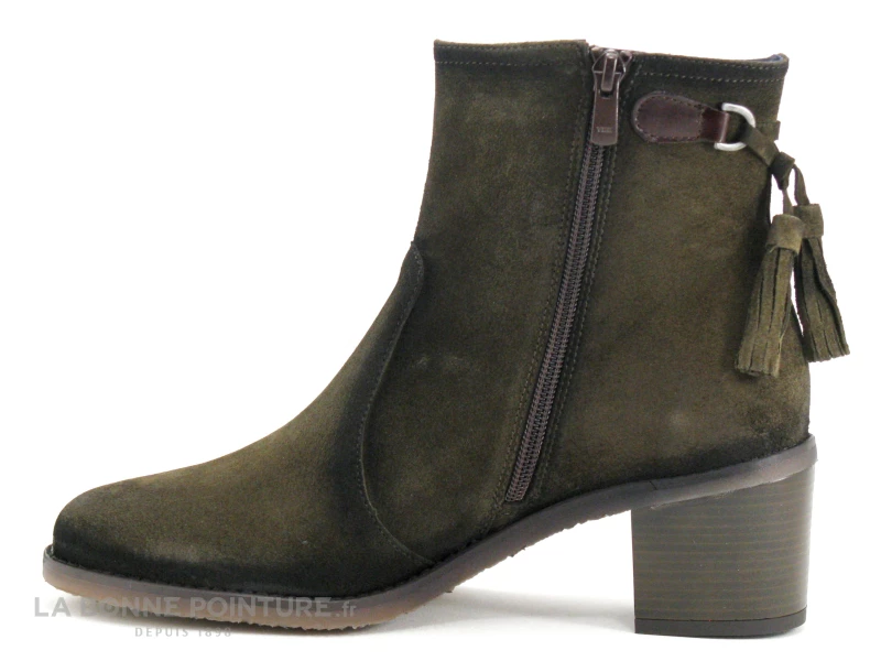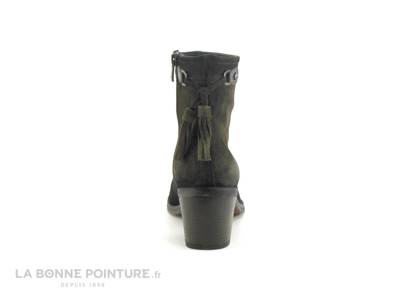 Ces boots Femme kaki sont en cuir velouté, avec des pompons à franges à l’arrière maintenus par des petites pattes en cuir marron café.