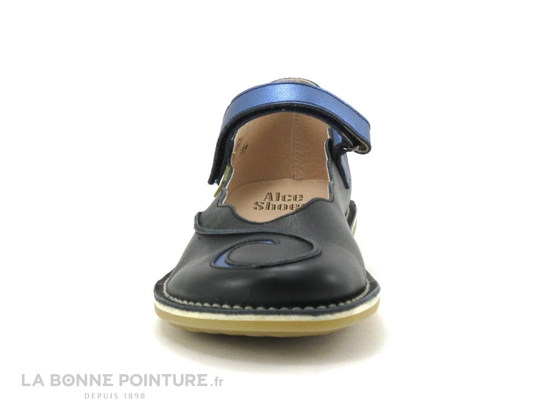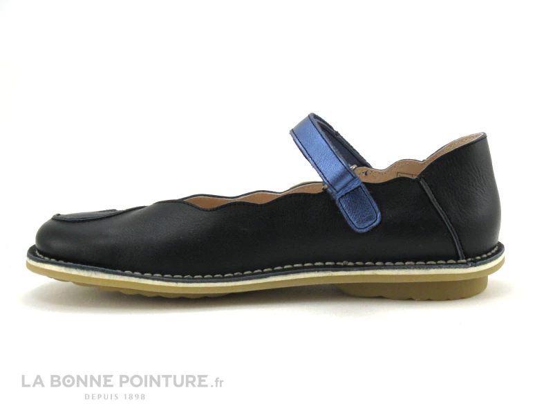 La bride à velcro en cuir bleu permet de fermer facilement la chaussure et assure un bon maintien du pied.