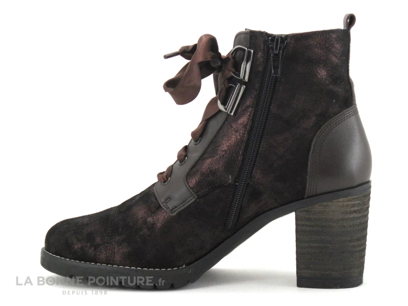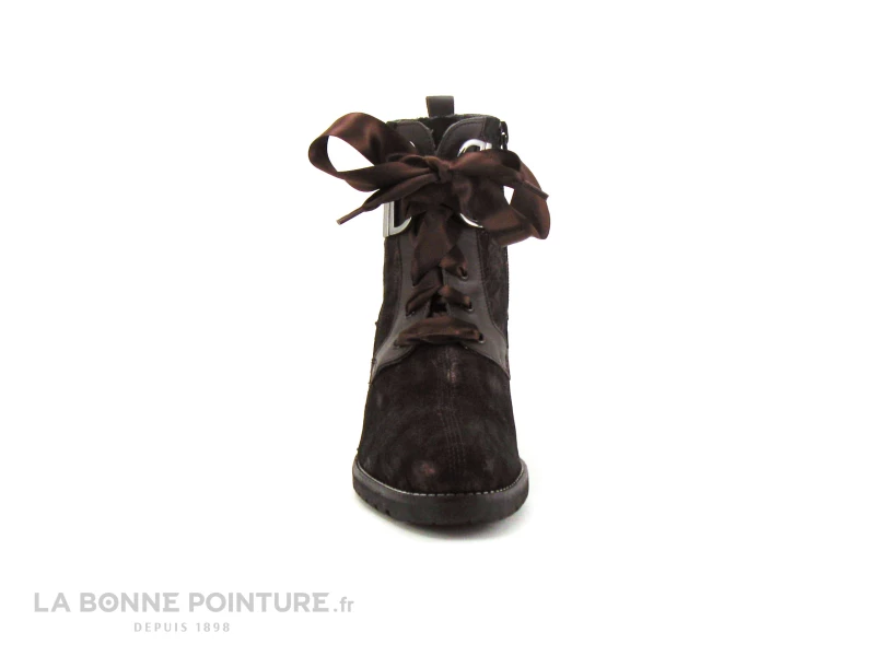 Cette bottine à talon haut Geo Reino Evolution est en cuir velours marron métallisé, avec des empiècements en cuir lisse marron.