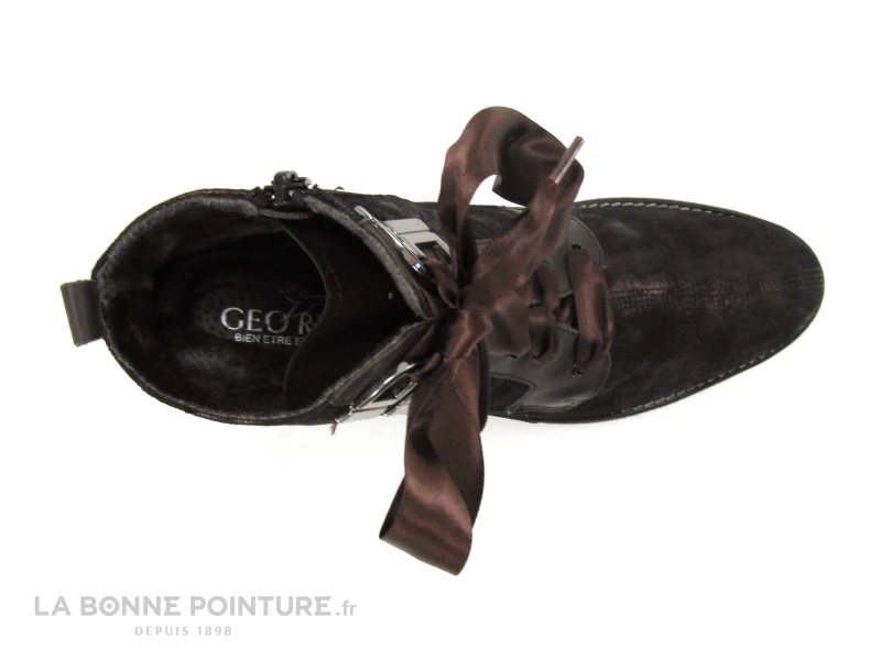 Le lacet ruban marron moka traverse 3 petits oeillet ainsi que 2 anneaux argentés, pour ajuster idéalement la chaussure Geo Reino à votre pied.