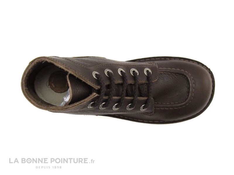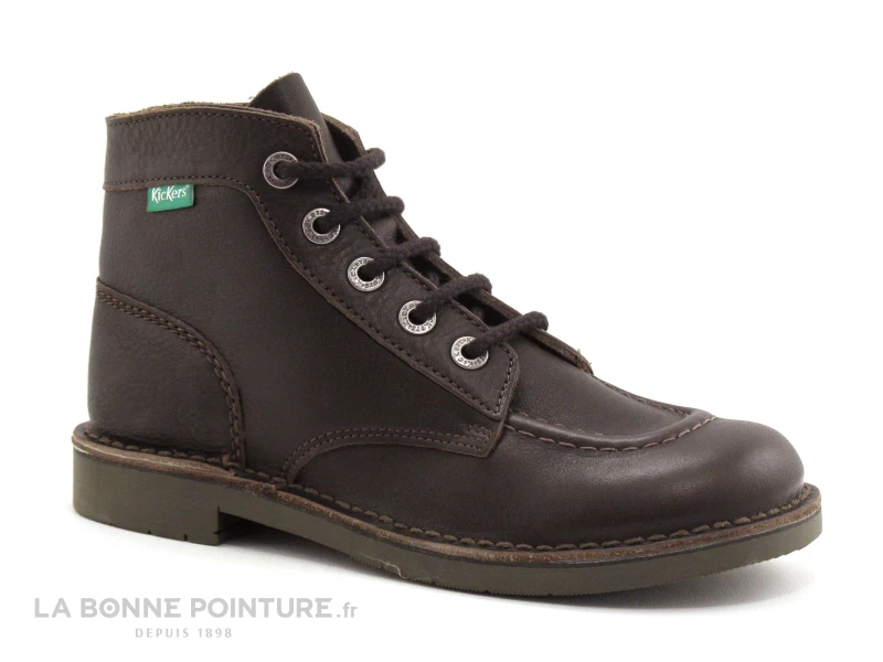 Un lacet marron foncé traverse 5 oeillets argentés gravés Kickers pour fermer les chaussures.