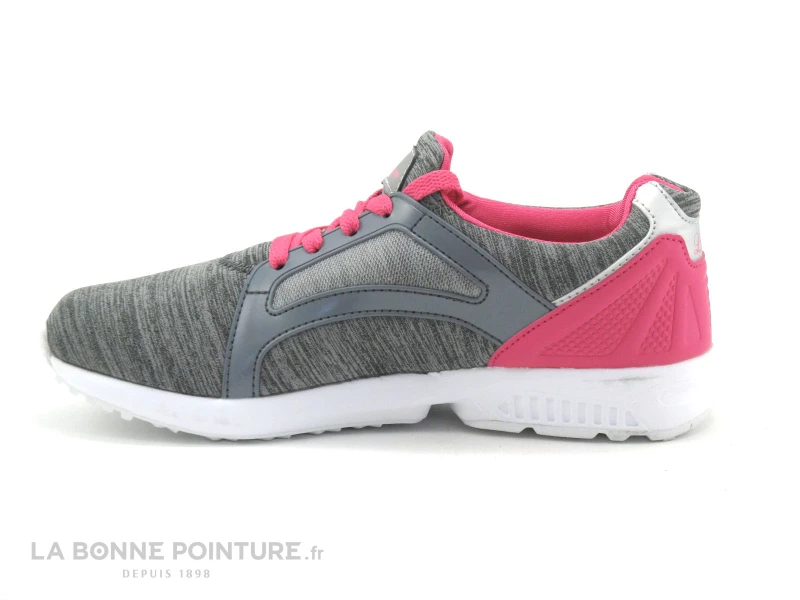 Cette chaussure de sport femme est en textile et matières synthétique, aux tons de gris clair, de rose et d’argent métal.