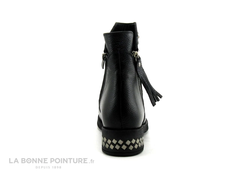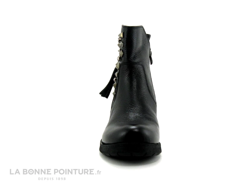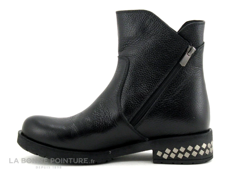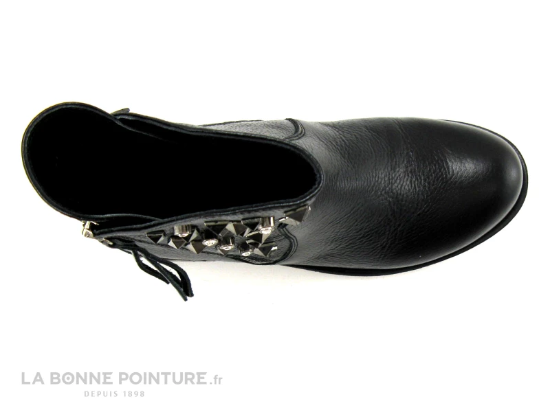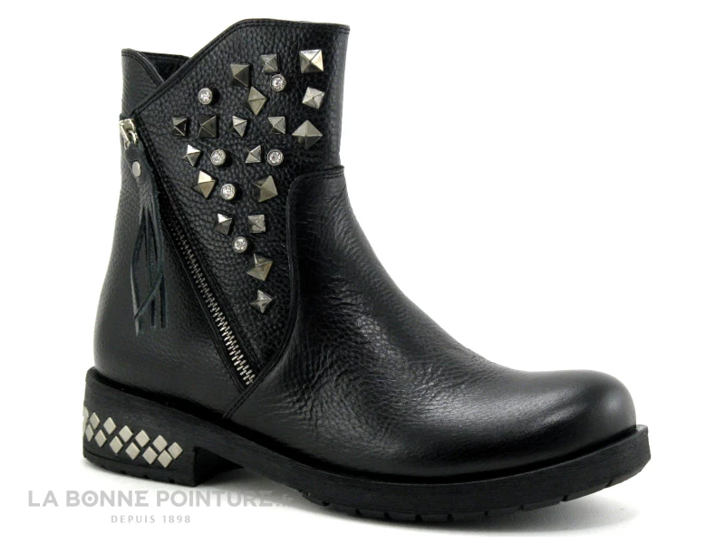 Cette bottine Femme est en cuir noir brillant à l’aspect grainé, avec des perles coniques et des diamants (factices !) qui ornent la tige.