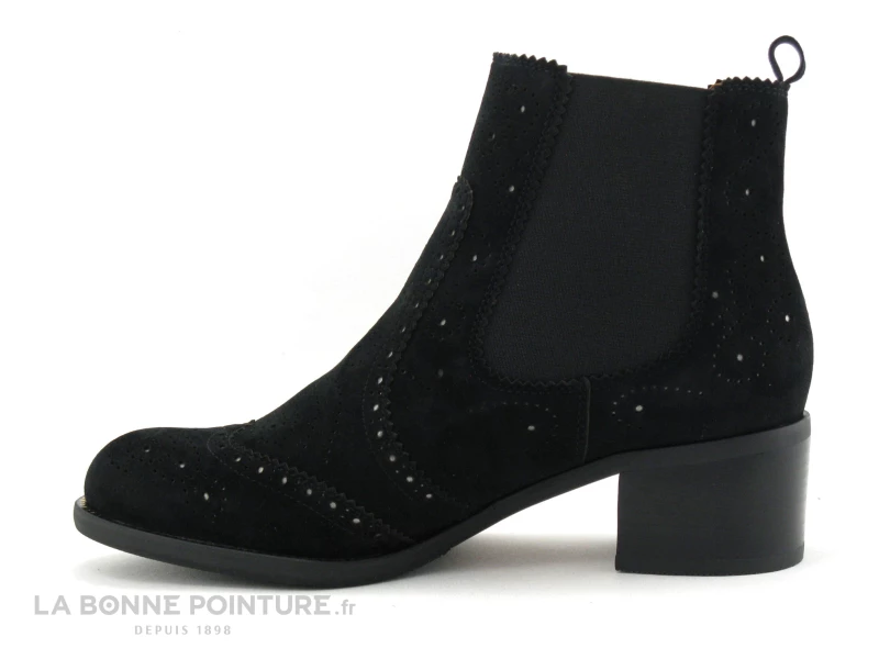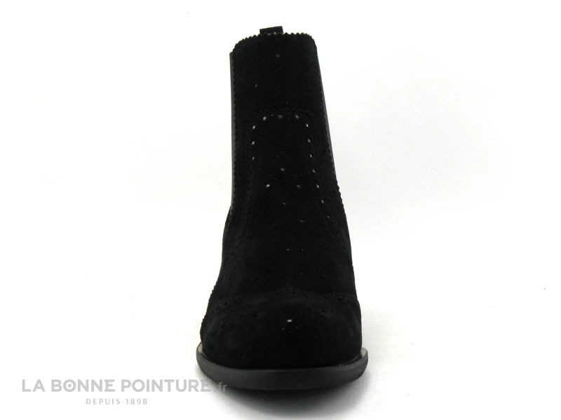 Ces boots Chelsea Femme sont en cuir velouté noir, délicatement travaillé avec des découpes dentelées. De petits cercles sont perforés dans le cuir et laissent apparaître du gris métal.