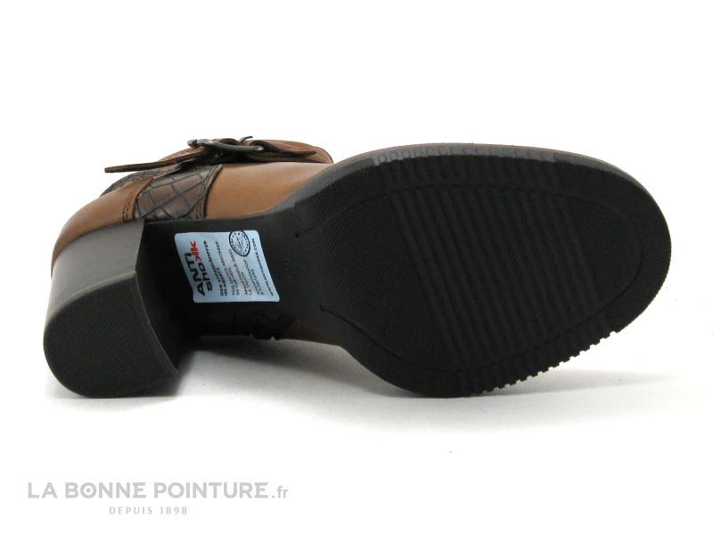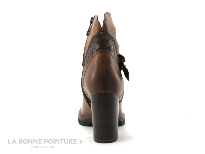 Cette bottine à talon haut et épais est en cuir marron clair (nut), avec une partie façon croco marron foncé.