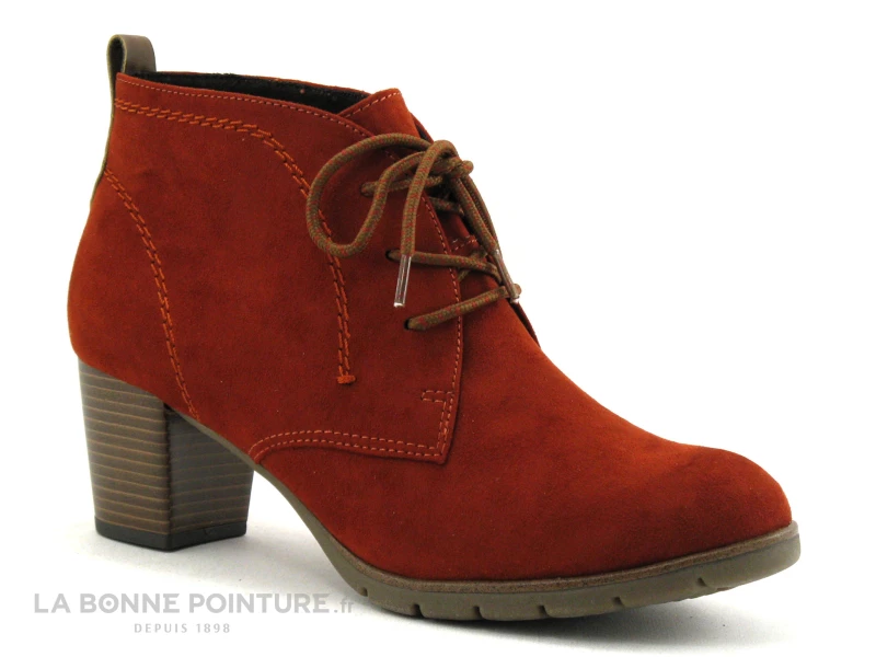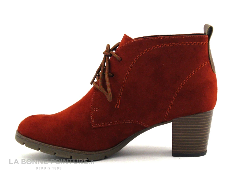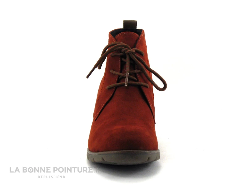 Cette belle chaussure montante Femme est en textile velouté orange brique, avec une petite languette camel à l’arrière.