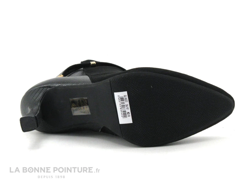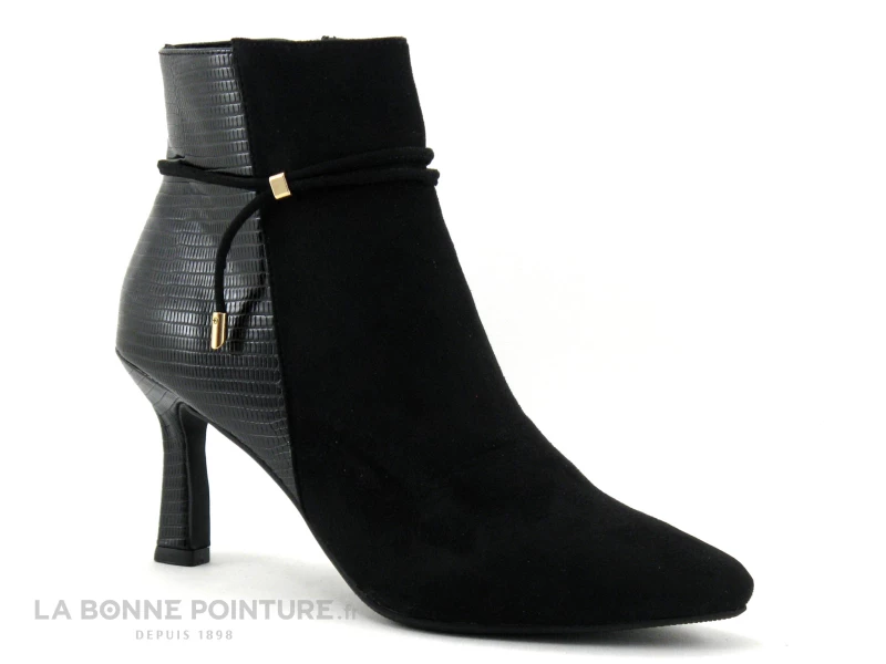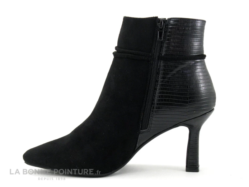 Cette bottine Femme à bout pointu mélange un textile velouté noir et un simili cuir brillant aspect serpent, pour un maximum d’allure…
