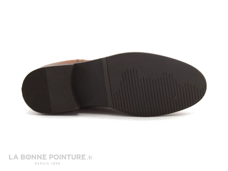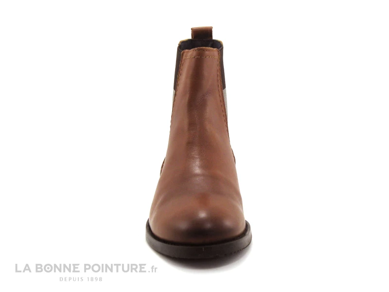 Cette bottine femme est en cuir marron cognac, avec une tige haute et des élastiques tricolores qui la différencient des autres…