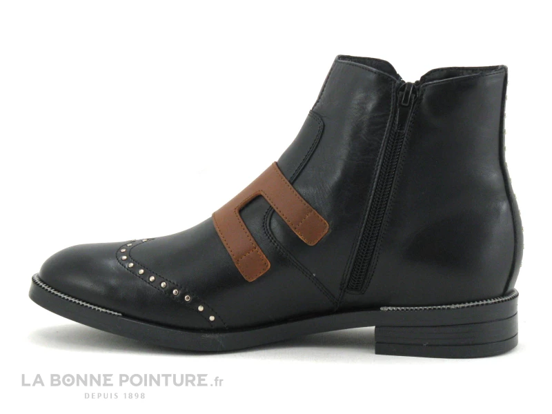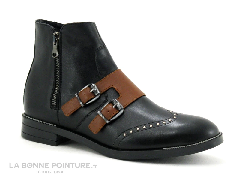Cette chaussure montante Femme est en cuir lisse noir, avec une large bride camel sur le dessus, attachée avec 2 boucles argentées.