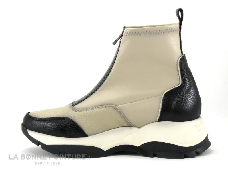 Ces belles boots Hispanitas Bolero sont bicolores beiges et noires, combinant cuir et stretch beige.