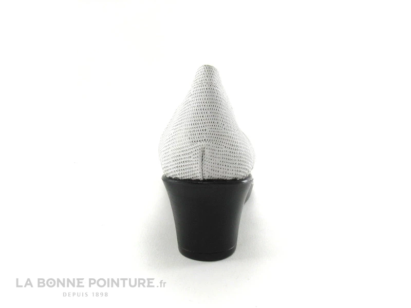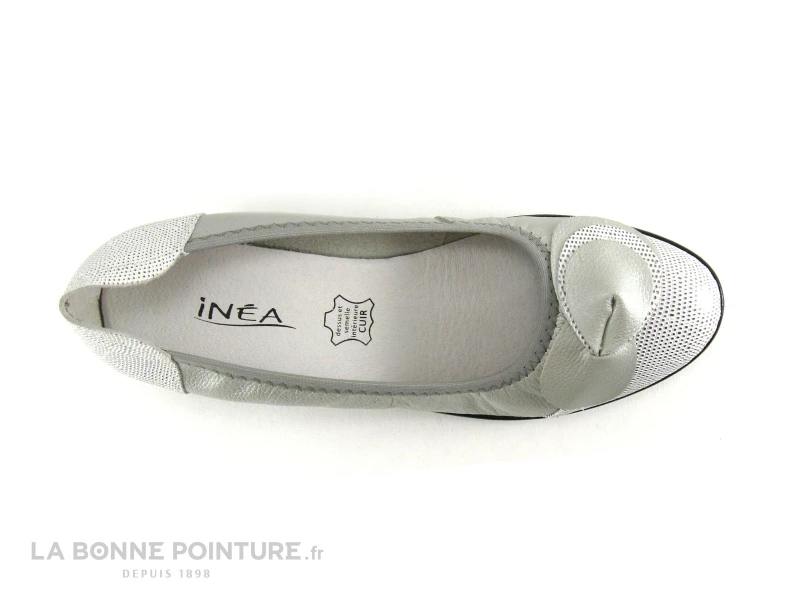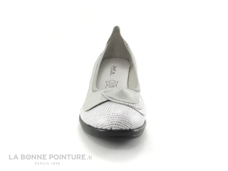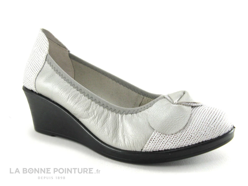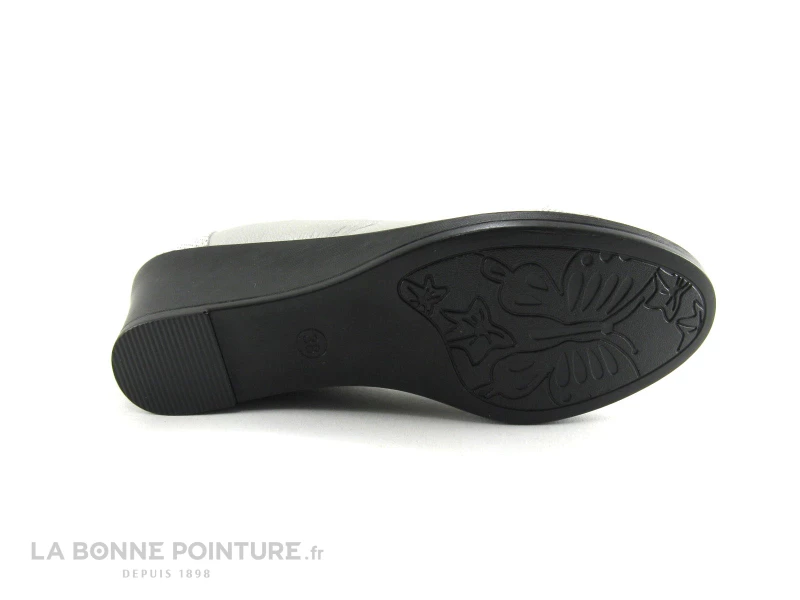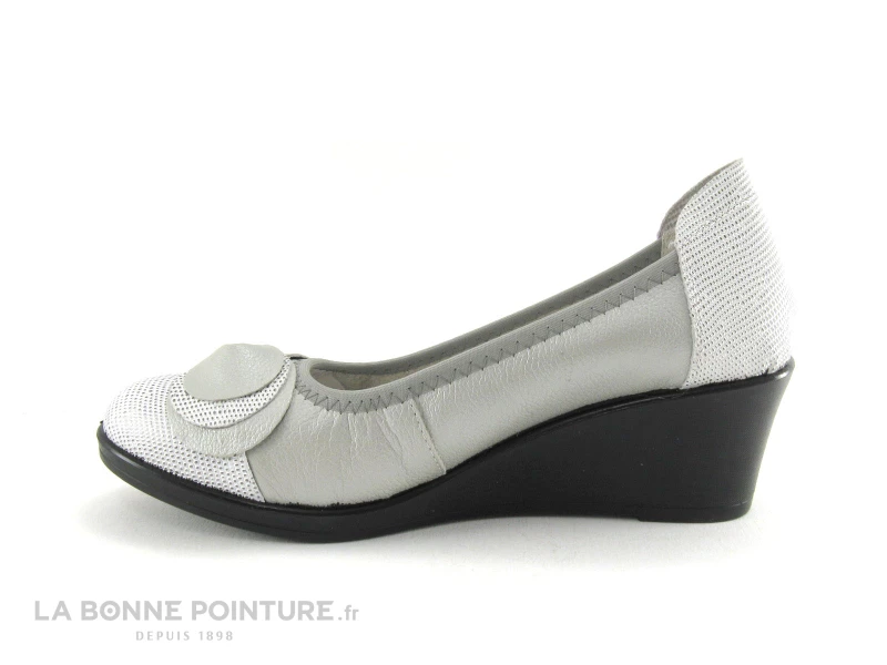 Cette chaussure femme est en cuir souple gris métallisé, avec la pointe et le contrefort en cuir blanc et argenté.