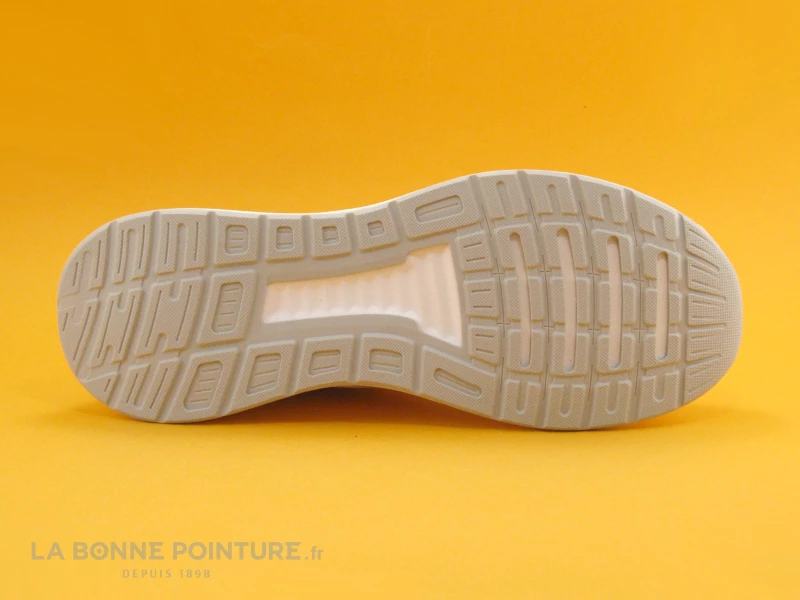 Cette chaussure de sport mixte est en textile respirant et matières synthétique blancs, avec un renfort qui remonte à l’arrière.