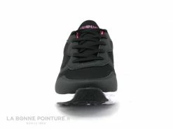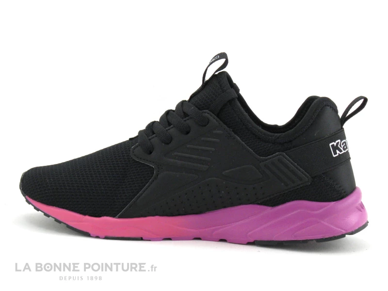 Cette basket slip-on fille ou Femme Kappa est en tissu maille et matières synthétiques noirs, avec la semelle qui flashe en rose fuchsia et violet.