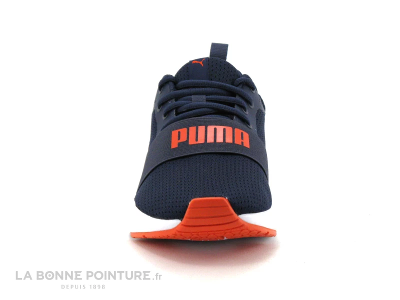 Cette basket bleu marine pour le sport ou pour le quotidien est en textile respirant, avec un élastique bleu sur l’avant marqué Puma en orange foncé.