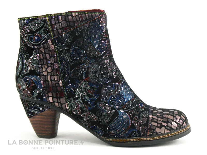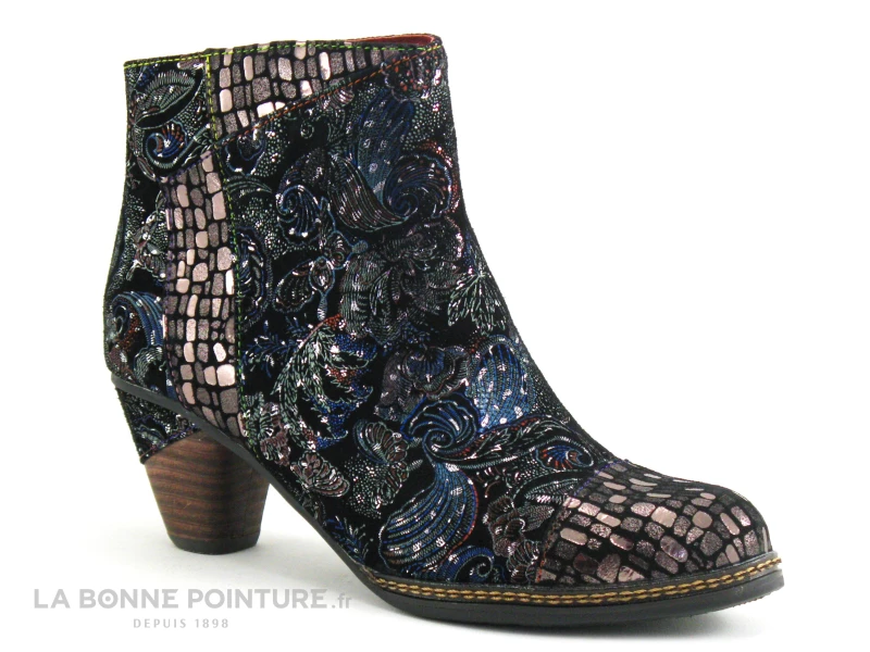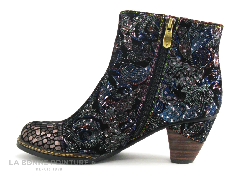 Cette bottine à talon Laura Vita est en cuir velours noir, parsemé de fleurs, feuillage et fioritures argentées et colorées.