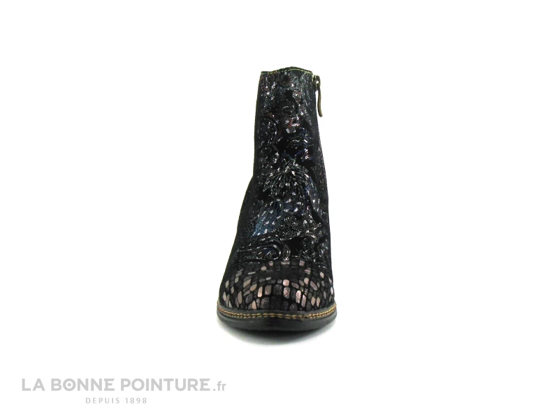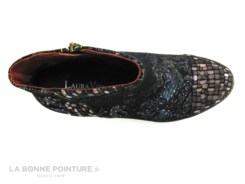 Un autre cuir fantaisie noir et bronze habille la pointe de la chaussure Laura Vita, on le retrouve sur le côté externe des boots.