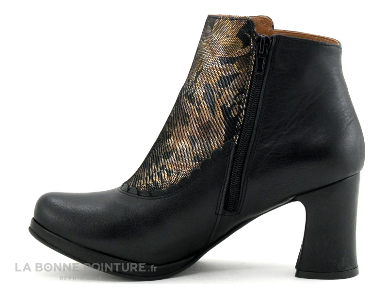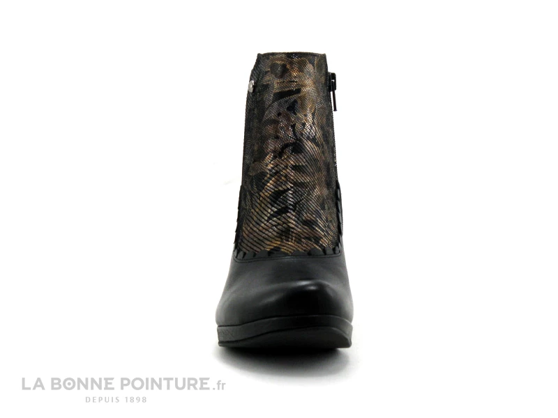 Cette bottine Femme mélange un cuir lisse noir et un cuir velouté fleuri, aux tons d’or, de bronze, de marron et d’argent (cuir mahonia).
