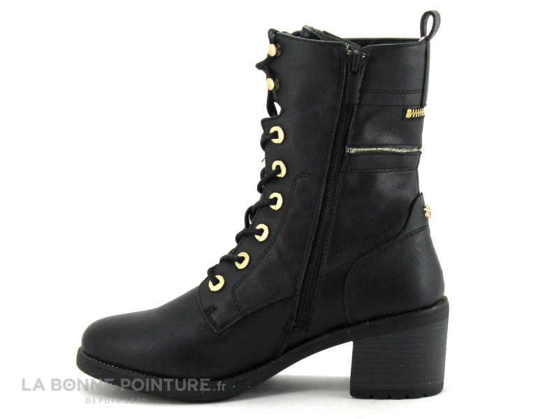 Cette ravissante bottine Mustang Femme est noire avec des petits détails Or qui donnent tout son charme au modèle : zip décoratif en haut des boots, liseré doré en-dessous, oeillets et crochets métalliques, sans oublier les petits clous sur la semelle…