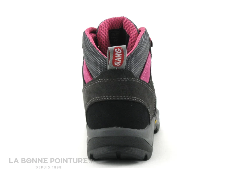 Cette chaussure de marche Femme Olang mélange cuir velours et textile, aux tons de gris anthracite et de rose fuchsia avec un peu de noir à l’arrière.