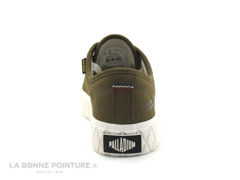 La marque Palladium s’affiche sur la languette des sneakers toile, ainsi qu’à l’arrière et sur une petite étiquette latérale.