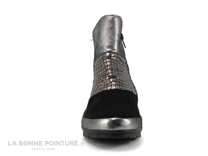 Cette bottine Femme est tout en cuir aux tons de noir, de bronze métal et d’argent, avec des parties veloutées, pailletées et aspect croco en parfaite harmonie.