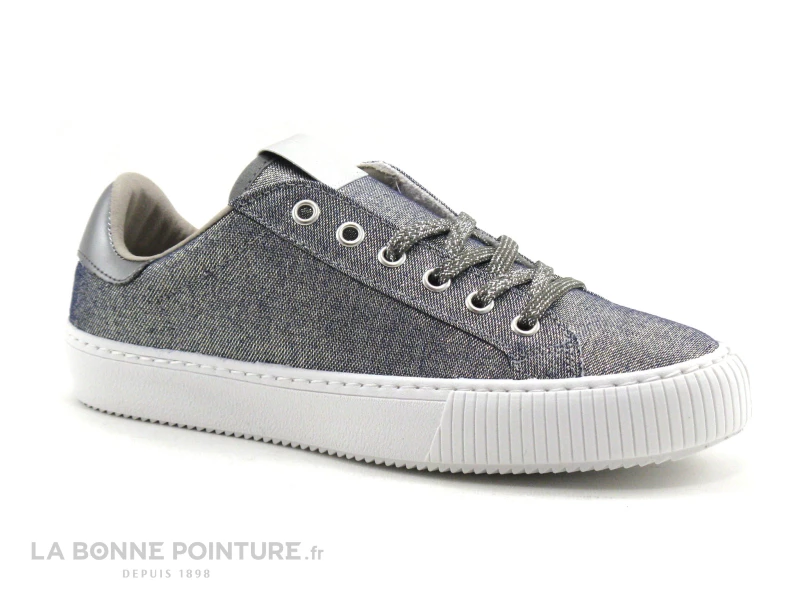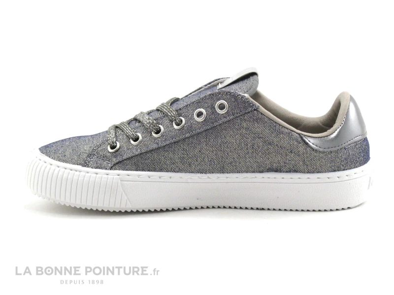Cette basket basse est en textile gris anthracite effet pailleté, avec le contrefort métallisé à l’arrière de la chaussure.